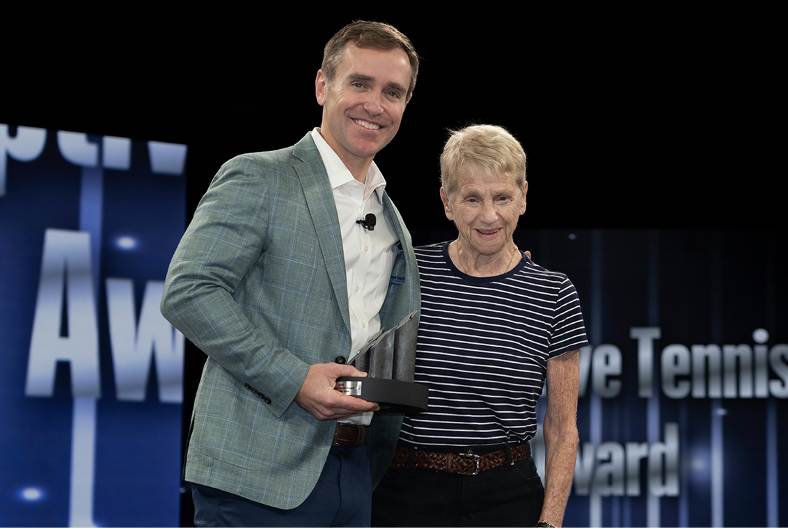 USTA interim co-CEO and Chairman of the Board and President Brian Vahaly poses with Janet Lefkowitz, representing HERO New York, and the trophy for the Adaptive Tennis Award at the 2026 Annual Meeting & Conference. Photo by Susan Mullane/USTA.